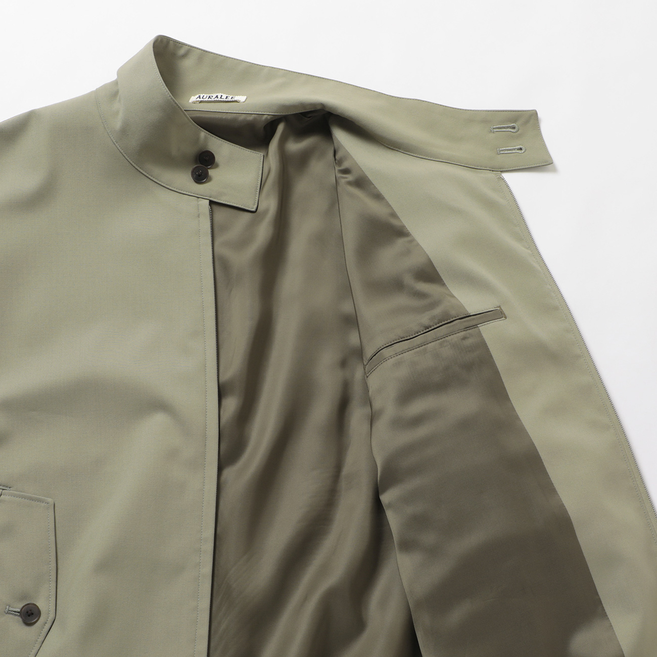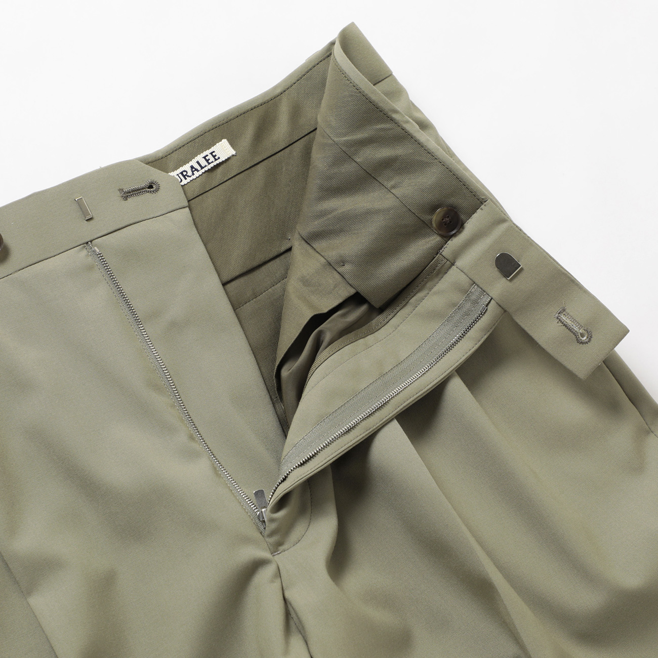 経緯ともに滑らかな超極細ウールを贅沢に使用し、極限まで高密度に織り上げたウールギャバジン。ウールの伸縮性を活かし、ハリコシを強調する加工と超撥水加工を施すことで、シワになりにくく、独特なハリやコシ、落ち着いた光沢が特徴のAURALEEの定番素材です。パンツにはタック無しのシルエットと、2タック入っているシルエットがあります。