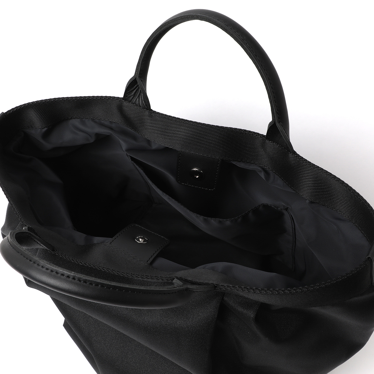 パンツのタックに着想を得た立体的なフォルムが特徴のMサイズバッグ。軽量で光沢のあるナイロンツイルに、厚手のナイロンテープとレザーハンドルを組み合わせ、実用性と上質さを両立しました。弱撥水加工を施したボディと裏地に加え、13インチPCも収納できる容量で、日常使いに適したデザインです。