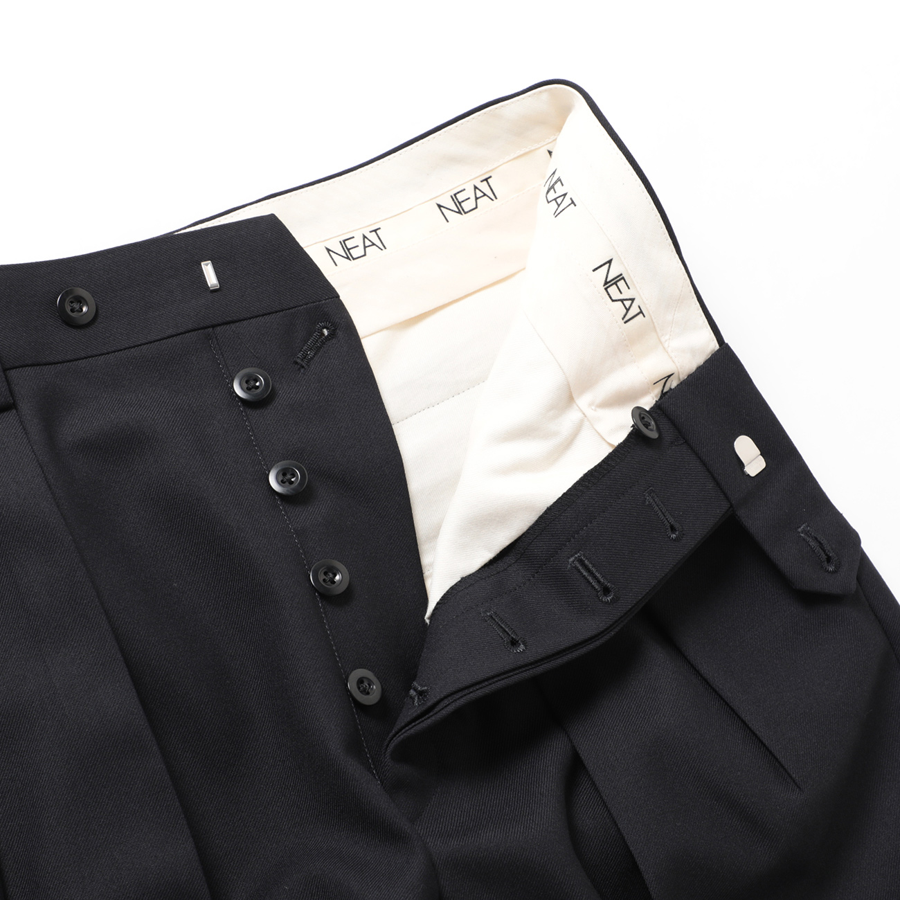 NEATのパンツは「2タック」が基本ですが、こちらのToniは真逆のノータック使用。それにちなんで、ニートを逆さ読みにした"Toni/トーニ"と名づけられました。