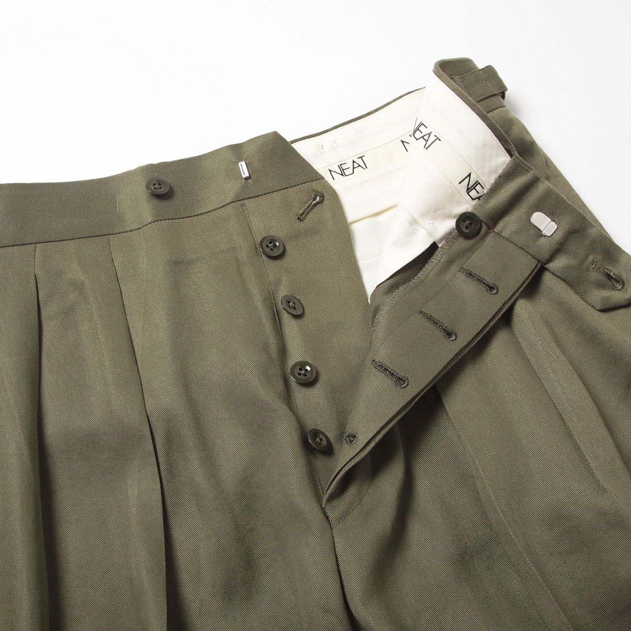 NEATといえば2タック。タックが内側に倒れている「インタック」を採用しているので、腰回りがすっきり見え、カジュアル過ぎない印象に。