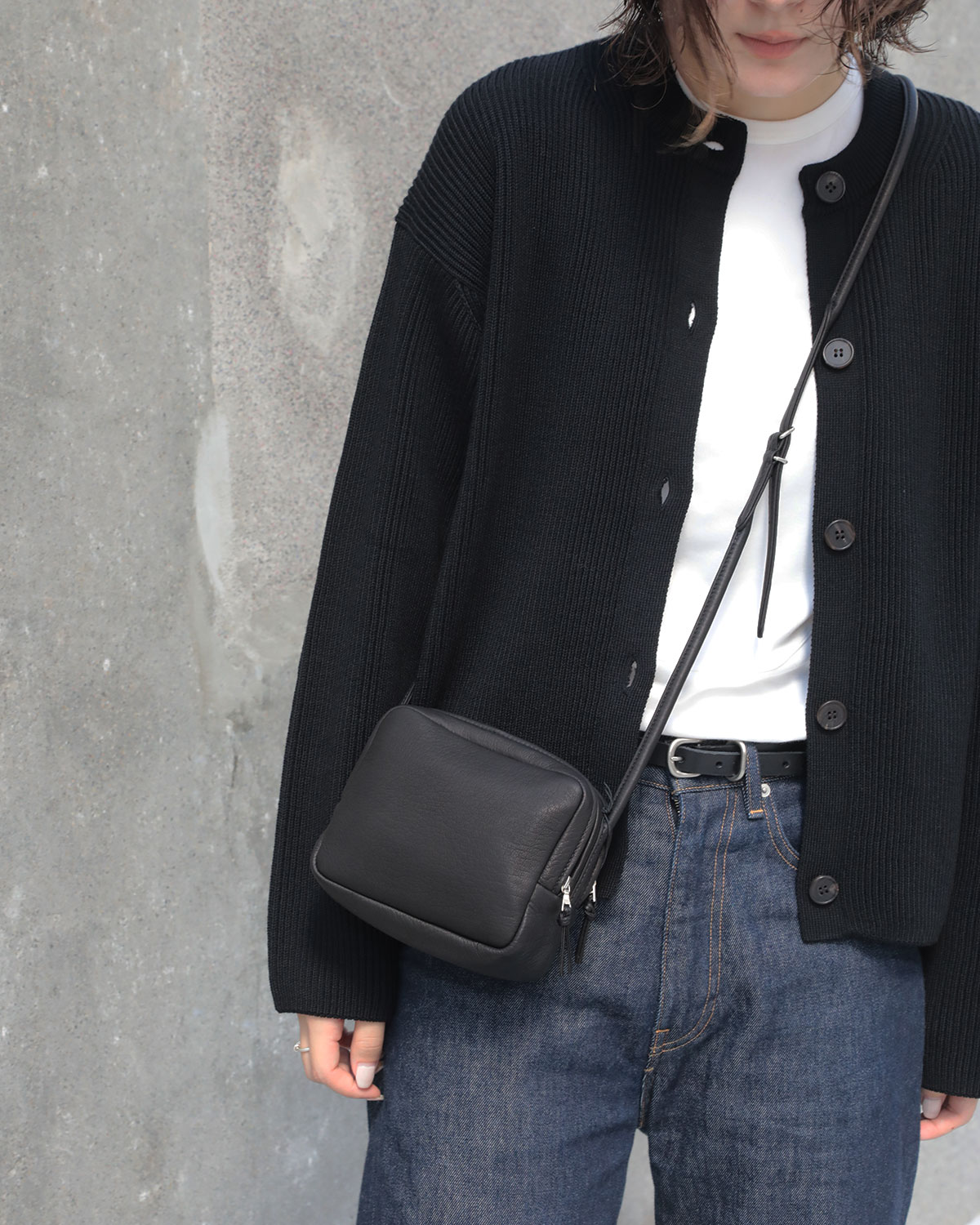 見た目は王道のレザー巾着バッグですが、ディアレザーのもっちりとした柔らかさや光沢の無いマットな質感が他には無い雰囲気を演出してくれます。ラフなスタイルにも馴染みますし、男性が持っても違和感が無いので、幅広い層におすすめしたいアイテムです。