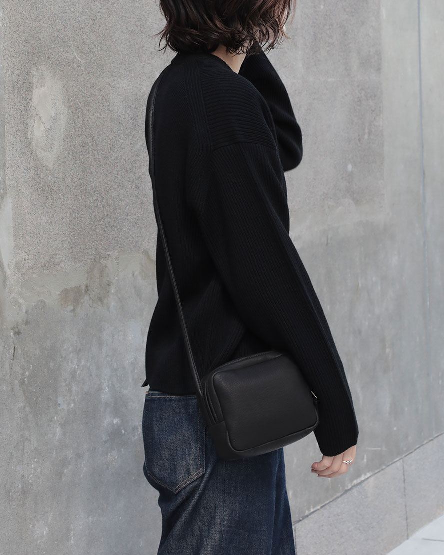 小ぶりのスクエア型ショルダーバッグです。ファスナーが二か所あり、それぞれ独立した収納になっています。収納の大きさはどちらも同じです。荷物がごちゃごちゃにならないので、バッグの中が常に整理された状態で使うことができます。ショルダー紐の長さが調整出来るので、Tシャツで薄着の時もコートなどの厚手のアウターに合わせるときも、ベストな長さで持つことができます。