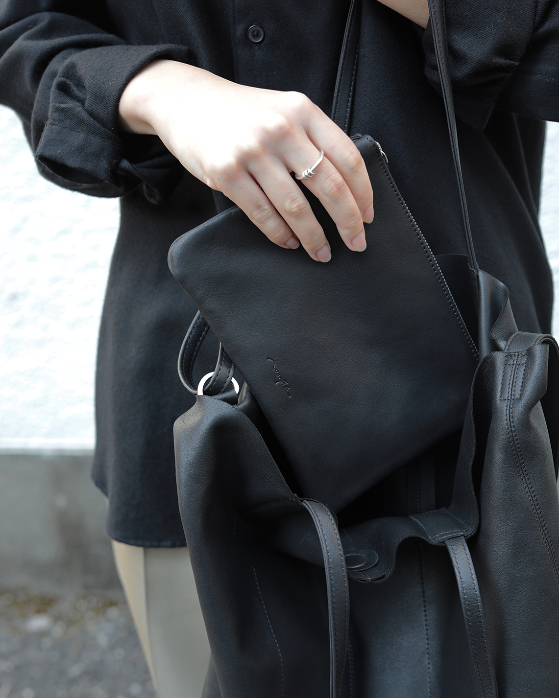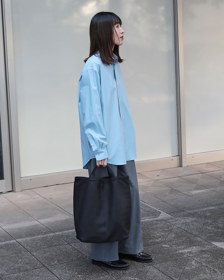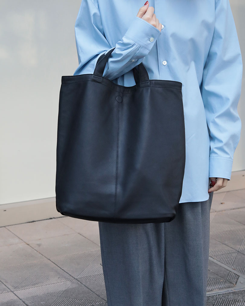 こちらは二重に生地を重ねているので、3WAY TOTEや2WAY ONE SHOULDERと比べると生地がしっかりとしていてコシがあるような印象があります。ですのでシャツやジャケットなどのカチッとしたスタイルにぴったり。通勤バッグを探されている方や上品なスタイリングが好みの方におすすめです。